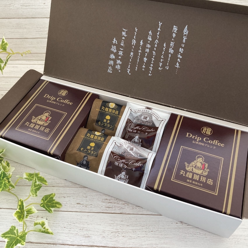 ■ 内容量:伝承香味ブレンド5パック入×2箱、焼きモンブラン×2個珈琲ケーキ×2個