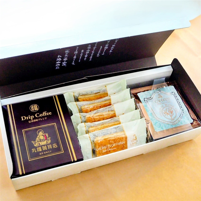 香り高くコク深いドリップ珈琲。世界三大銘茶・ダージリンセカンドフラッシュをメインに使用した贅沢な紅茶。丸福珈琲店アーモンドフロランタンをセットにしました。羽田空港限定ギフトセットです。