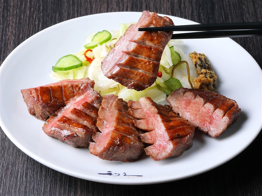 牛たん専門店【牛たん炭焼利久】の店舗でご提供している厚切り牛たん極。たん元に近い部位を職人が厳選し一枚一枚丁寧に仕込み、定番の牛たんよりも厚切りに。