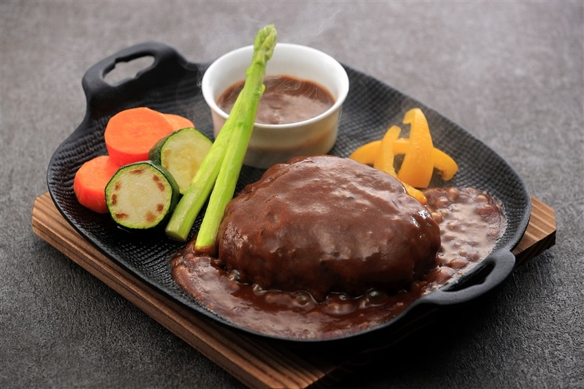 柔らかくジューシーなハンバーグを、コクと旨みのデミグラスソースで仕上げました。溢れ出る肉汁と相性抜群の特製デミグラスソースです。