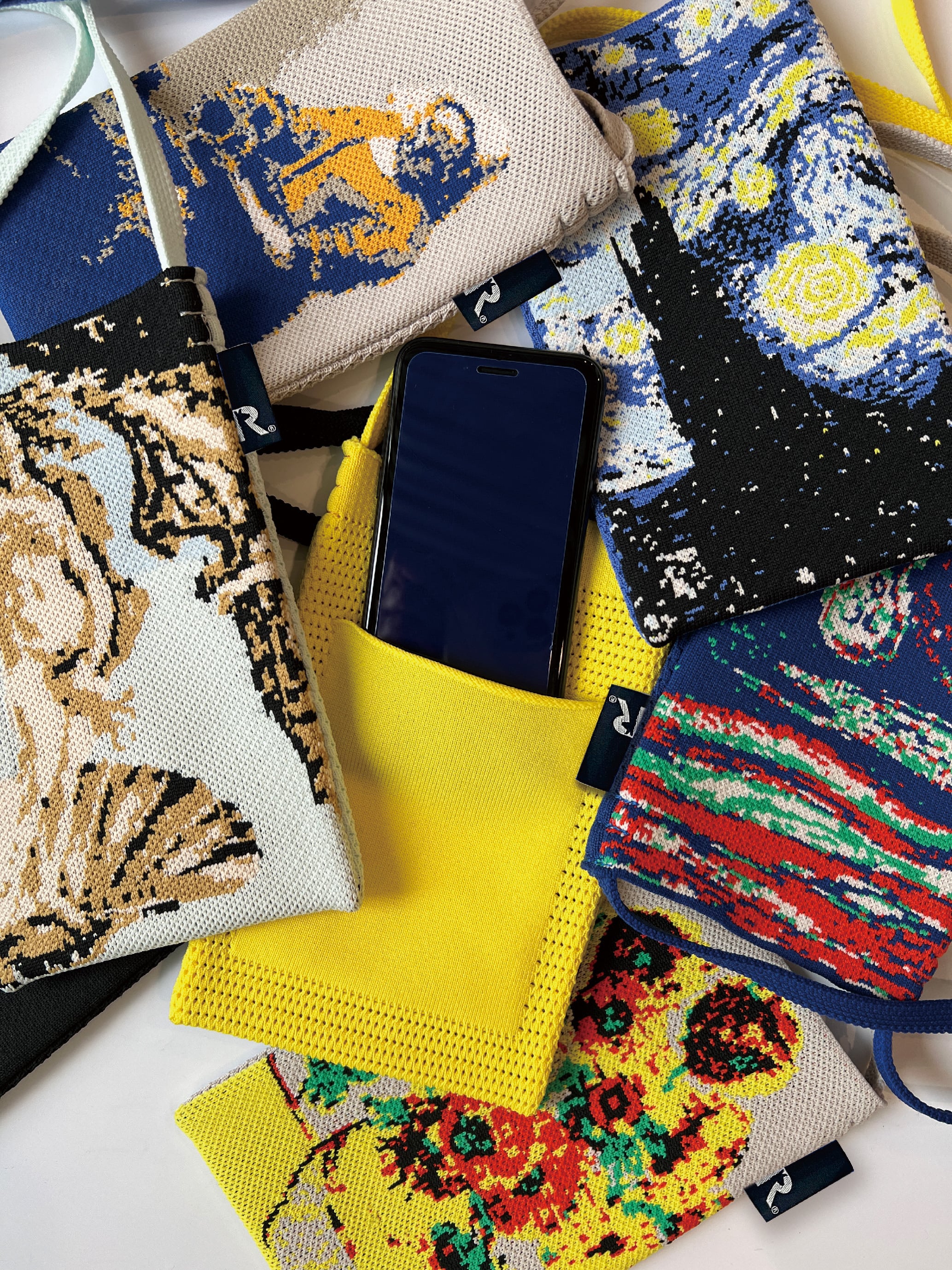 小物の収納に便利なルーポケットは、本体と一体で編まれているので、縫い目がないつくり。