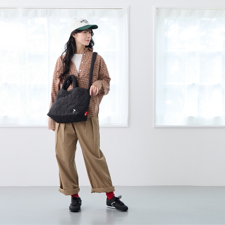 丈夫なナイロン生地に、スヌーピーのシルエットのキルティング加工を施しました。