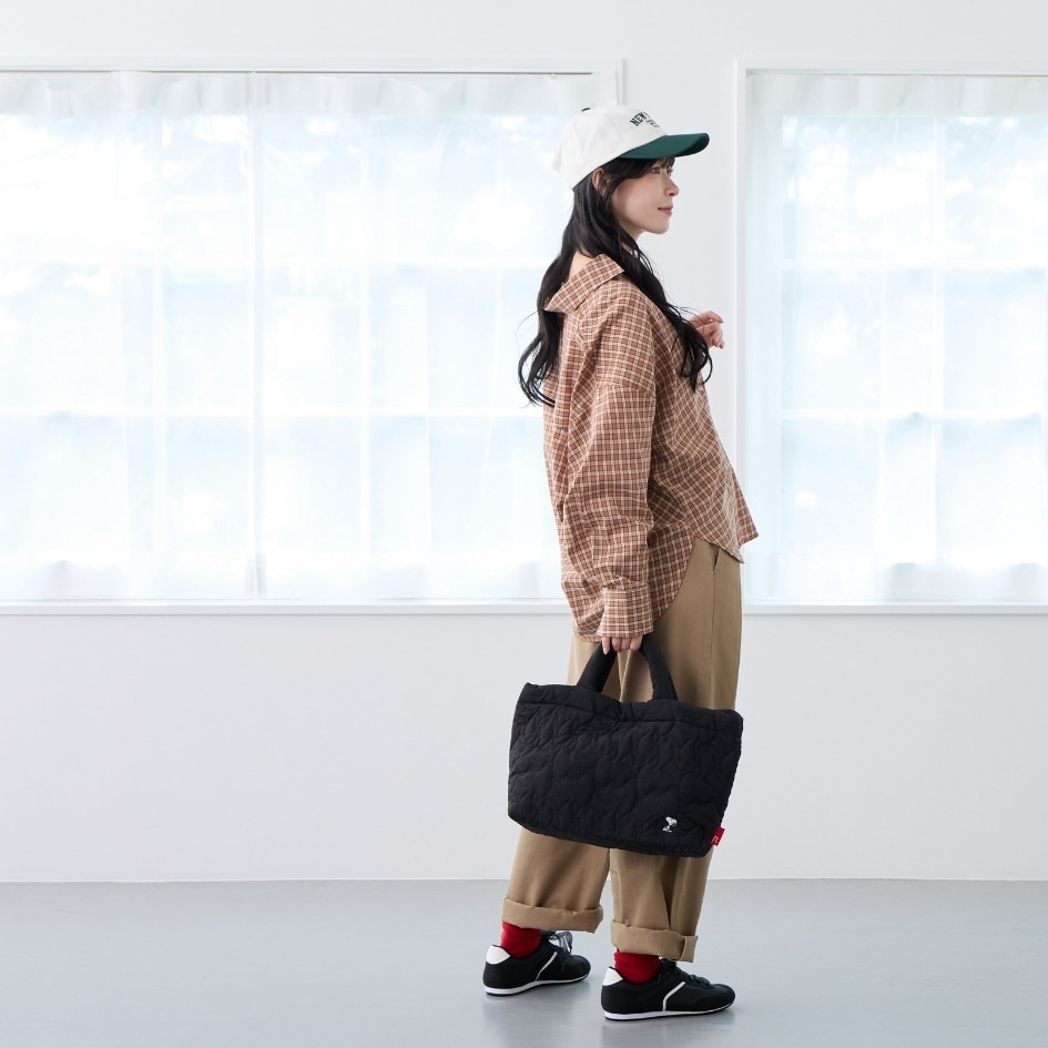 丈夫なナイロン生地に、スヌーピーのシルエットのキルティング加工を施しました。