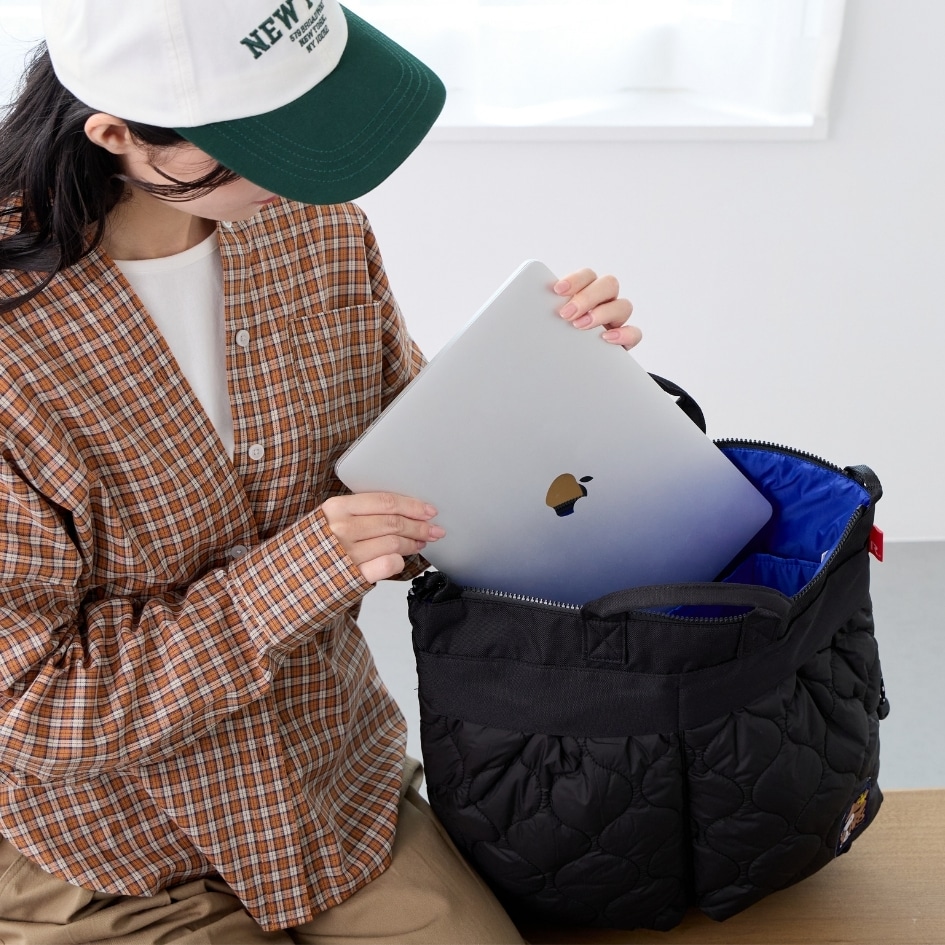 丈夫なポリエステル生地の本体にキルティング加工の大きめポケット。