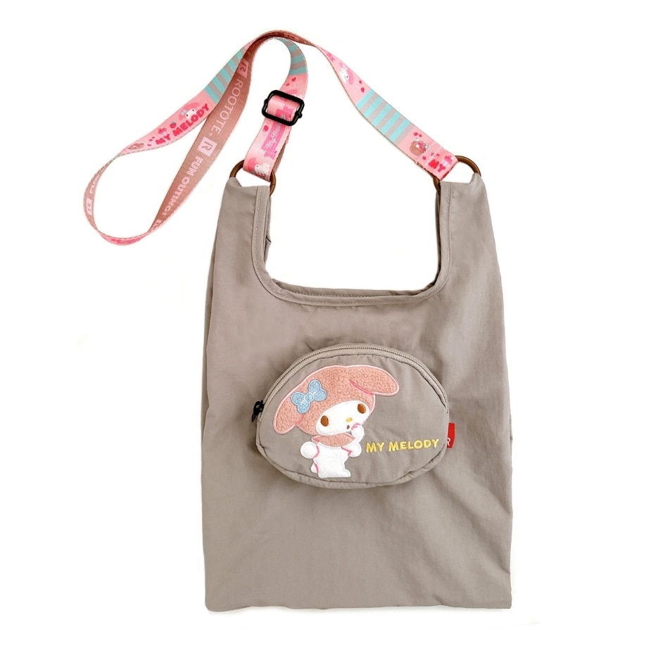 振り向きポーズがキュートなキャラクター刺繍入りポケットがポイントのショッパーバッグ。