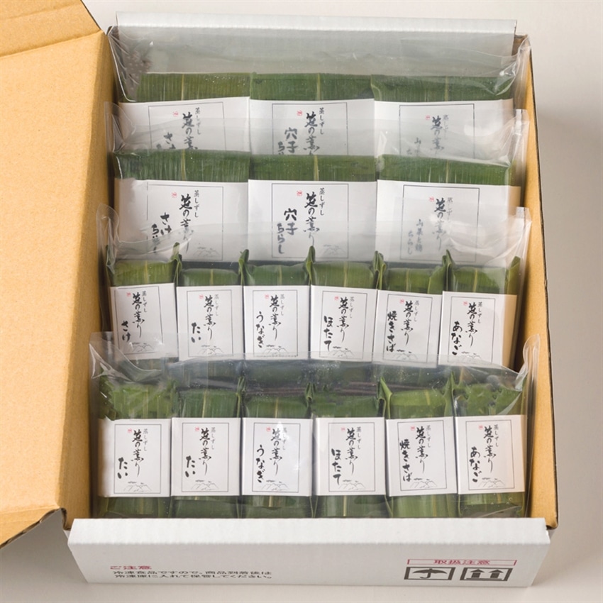 あなご、うなぎ、ほたて、たい、焼さば、さけなど9種類の味を一つずつ笹で包みました。