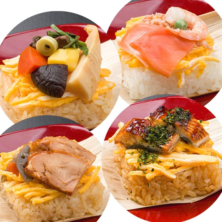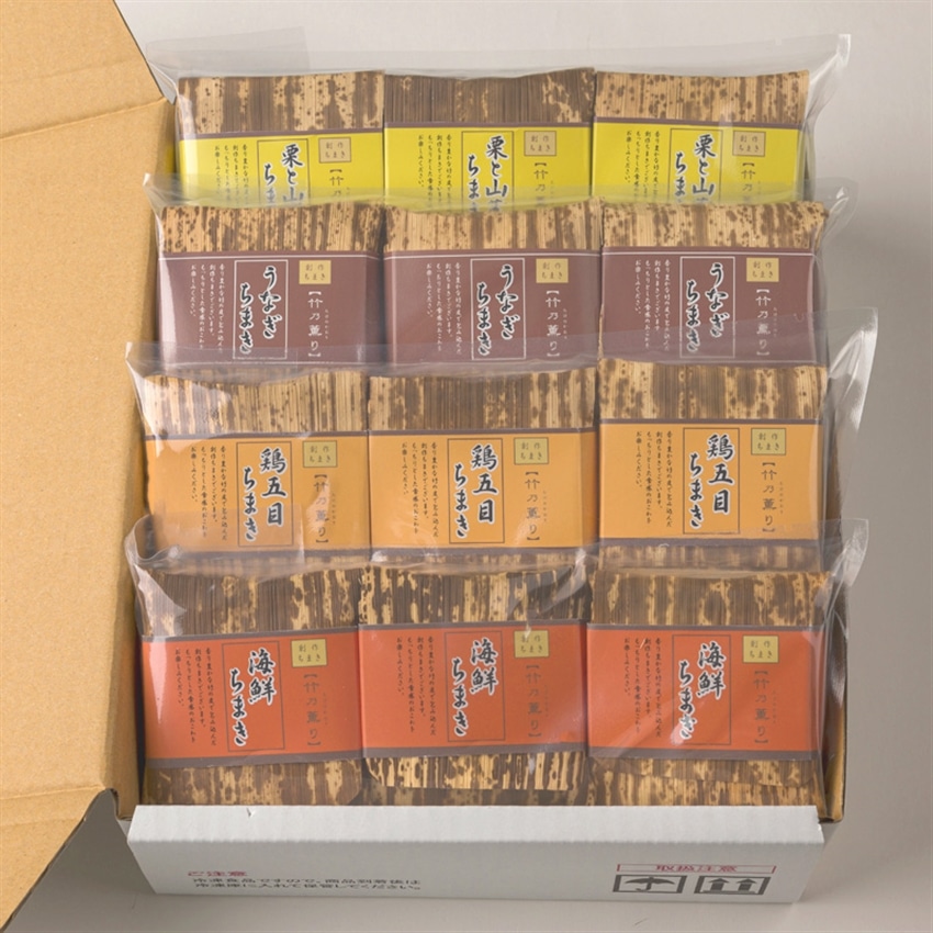 【栗と山菜】、【うなぎ】、【鶏五目】、【海鮮】の四種類をそれぞれ3個ずつ詰合せました。竹の皮で一つずつ包んでいるので、好きなときに好きなだけ食べられます。