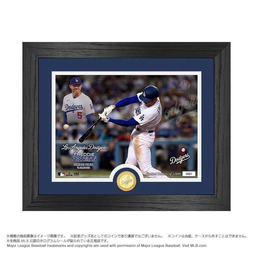 フレーム上部には躍動感あるフレディ・フリーマン選手のビジュアルを配置し、下部にはロサンゼルス・ドジャースのロゴを刻印した直径39mmのブロンズコインをセット。