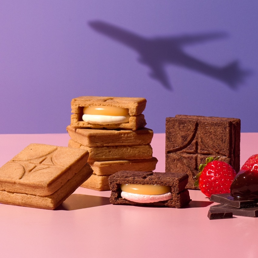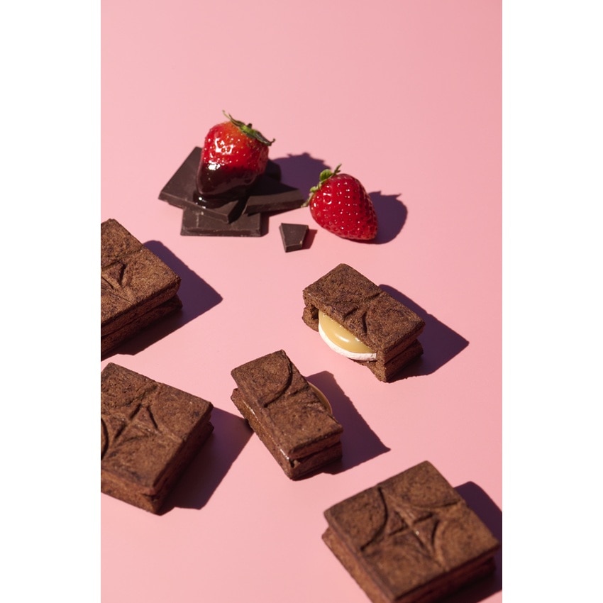 香ばしいチョコクッキーで包んだのは、フリーズドライ苺が香る、軽やかなバタークリームと、とろりとしたオリジナルキャラメル。