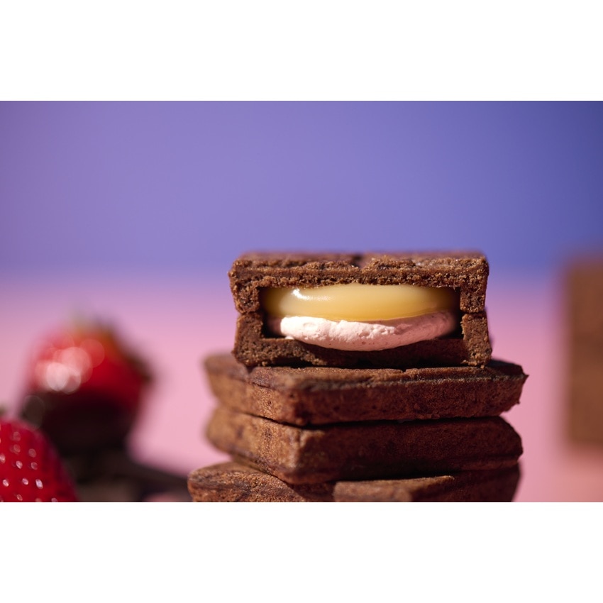 ベルギー産チョコレートを使用したビター風味のチョコレート生地に、苺ペーストとストロベリーパウダーを練りこんだバタークリーム、そしてオリジナルキャラメルを贅沢にサンドしました。