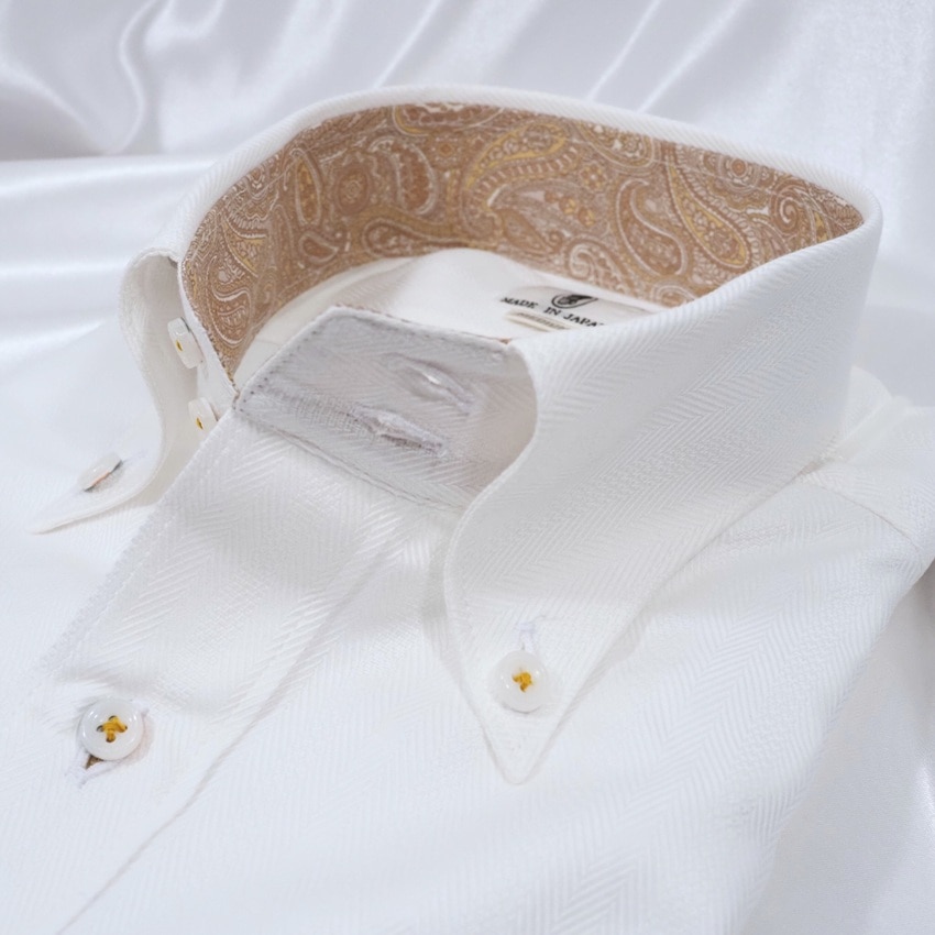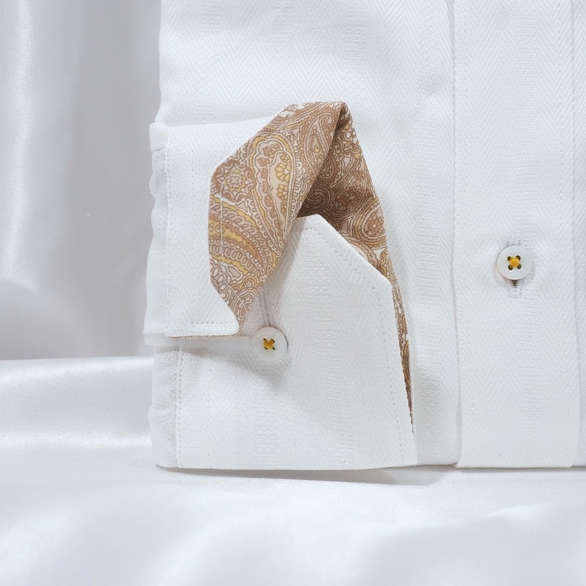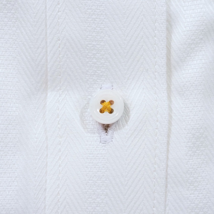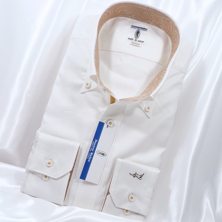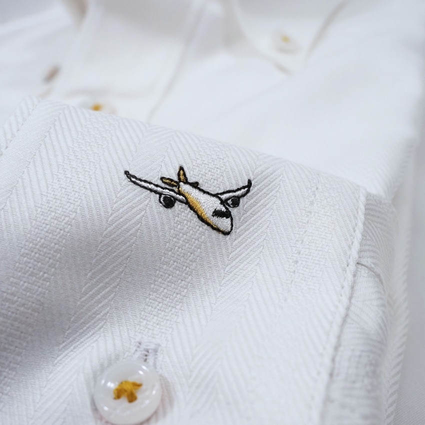 左カフスにワンポイント飛行機刺繍が入った長袖ワイシャツです。生地はヘリンボーンストライプ。