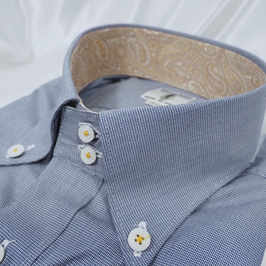 左カフスにワンポイント飛行機刺繍が入った長袖ワイシャツです。生地はマイクロ千鳥柄。