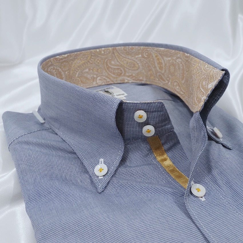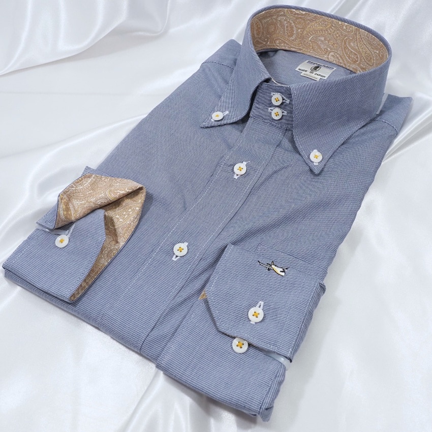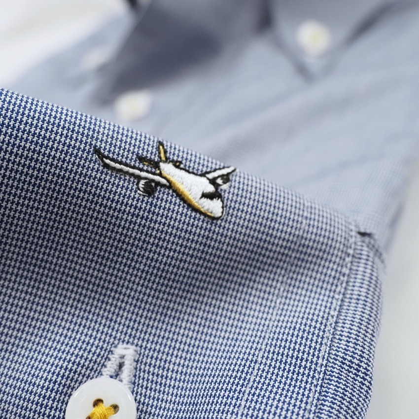 左カフスにワンポイント飛行機刺繍が入った長袖ワイシャツです。生地はマイクロ千鳥柄。