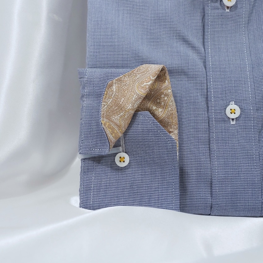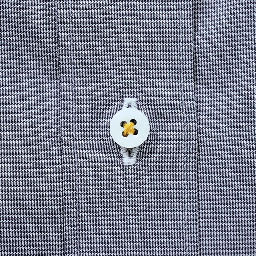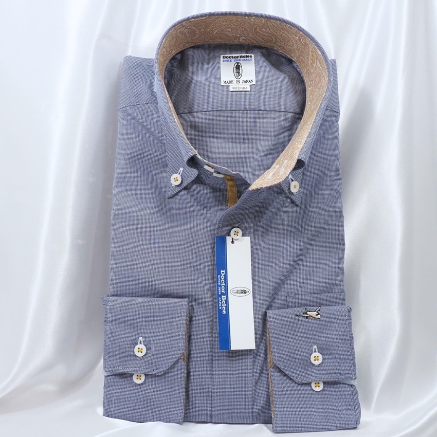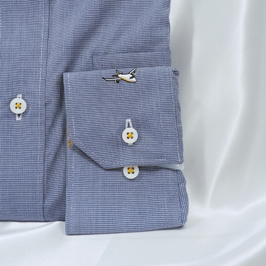 左カフスにワンポイント飛行機刺繍が入った長袖ワイシャツです。生地はマイクロ千鳥柄。