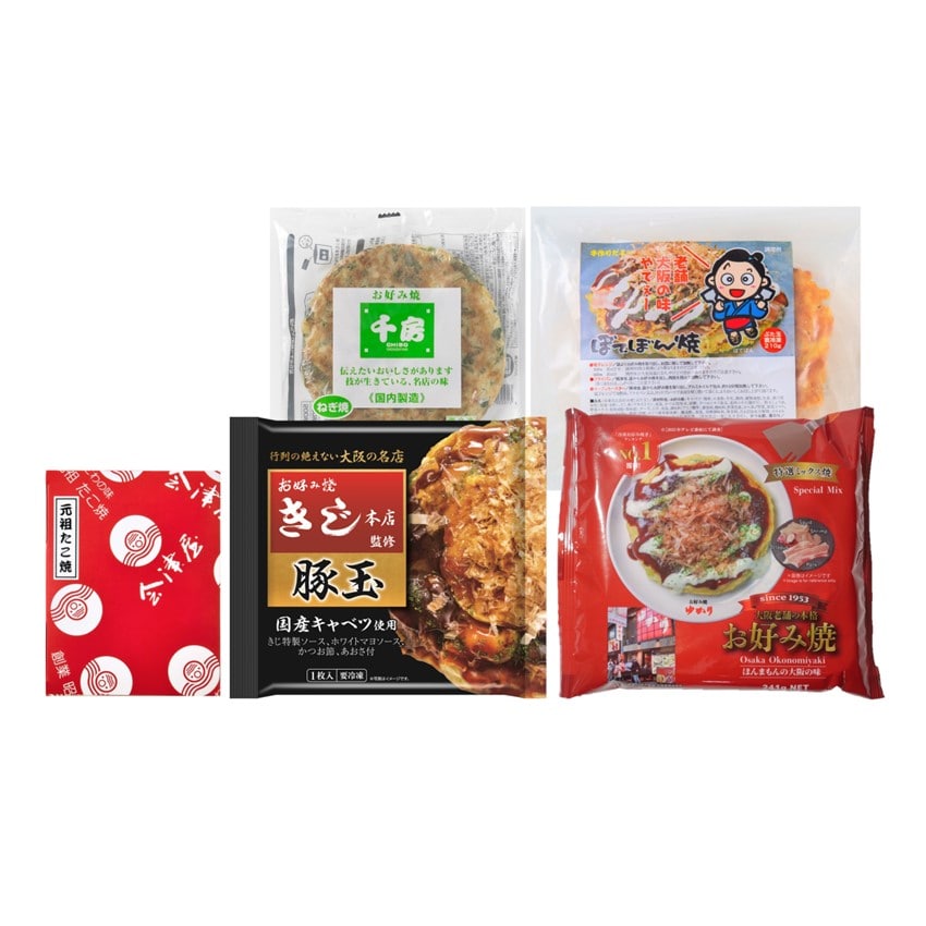 【商品説明文】大阪を代表する5店舗の味をご自宅でお楽しみいただけます。大阪はもとより、世界をも魅了する〈千房〉、マヨネーズをお好み焼にかける食べ方・モダン焼を誕生させた〈ぼてじゅう〉、洋食の技を活かした独自レシピと厳選素材で、大阪の味を進化させ続ける〈ゆかり〉、いつも行列の絶えない人気店として長年の人気を誇る〈きじ〉、大阪の代表的な食べ物”たこ焼き”の生みの親〈会津屋〉、それぞれの個性が光る自慢の商品が揃いました。