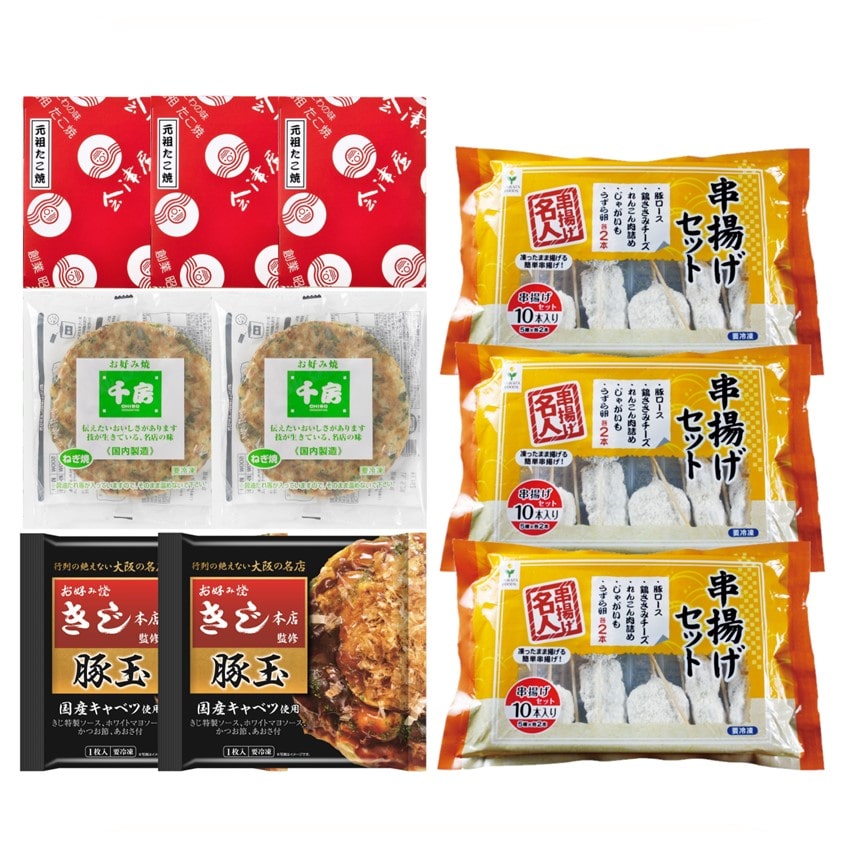 【商品説明文】たこ焼き発祥の名店「会津屋」のダシ香るたこ焼き、ふわっと香ばしい「きじ」のお好み焼き、サクサク食感が楽しい本場仕込みの串カツ、大阪はもとより、世界をも魅了する「千房」のお好み焼きを詰め合わせました。これひとつで、大阪の食い倒れ文化を自宅で楽しめる、贈り物にも最適なセットです。
