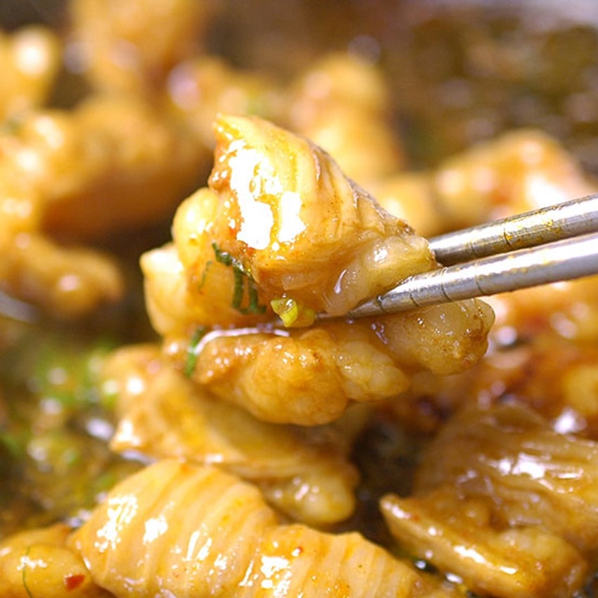 【商品説明文】テッチャン(シマチョウ)をりんご、黄桃、パイナップルをたっぷり使った醤油ベースの甘辛タレに漬け込みました。頬張るとテッチャンならではの甘い脂身が、口の中にジュワ~っと広がり、あとからコリコリとした食感が楽しめます。