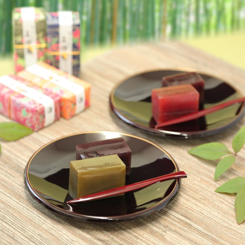 【商品説明文】友禅のデザインをあしらった雅で可愛らしい羊羹です。粒、栗、茶、梅の4つの味をお楽しみください。