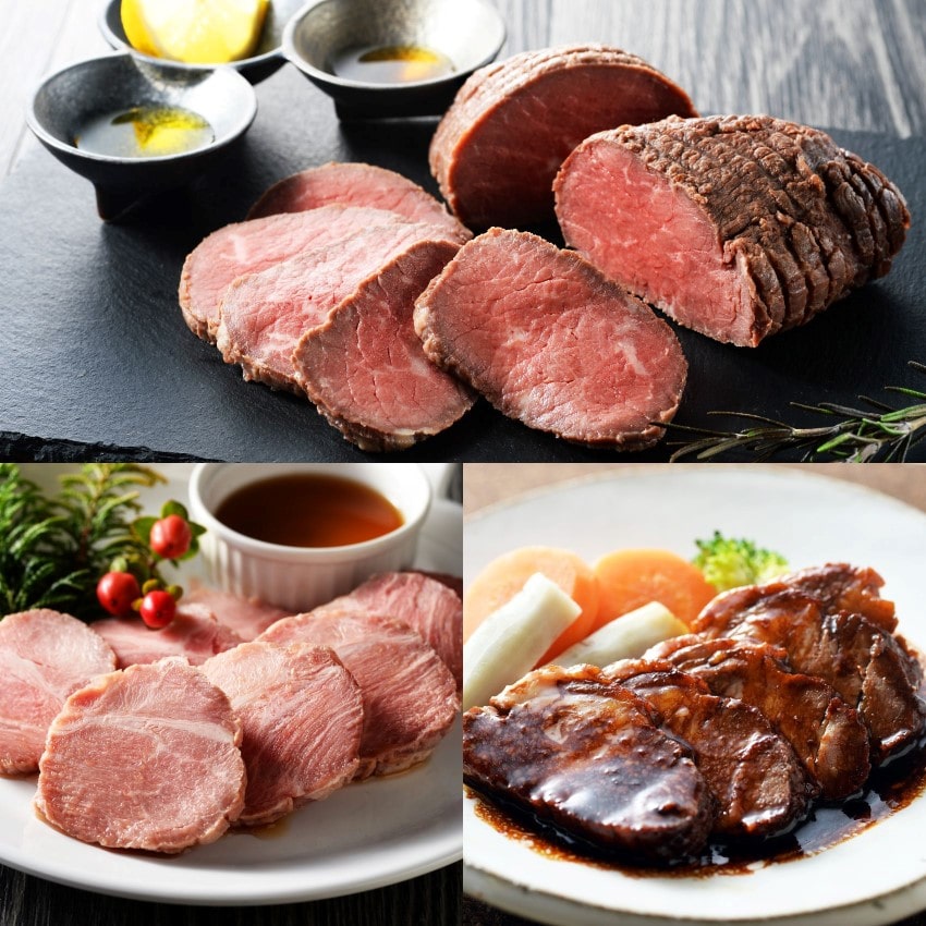 【商品説明文】手間を惜しまず美味しさを追求したこだわりのバラエティセットです。塩をすり込み、ひとつひとつ丹念に表面を焼き上げた「ローストビーフ」と「ローストポーク」は、低温でじっくりと加熱することで柔らかく仕上がっております。北海道産の豚肩肉を使用した「煮豚」は、甘く香ばしいたれでじっくりと柔らかく煮込みました。