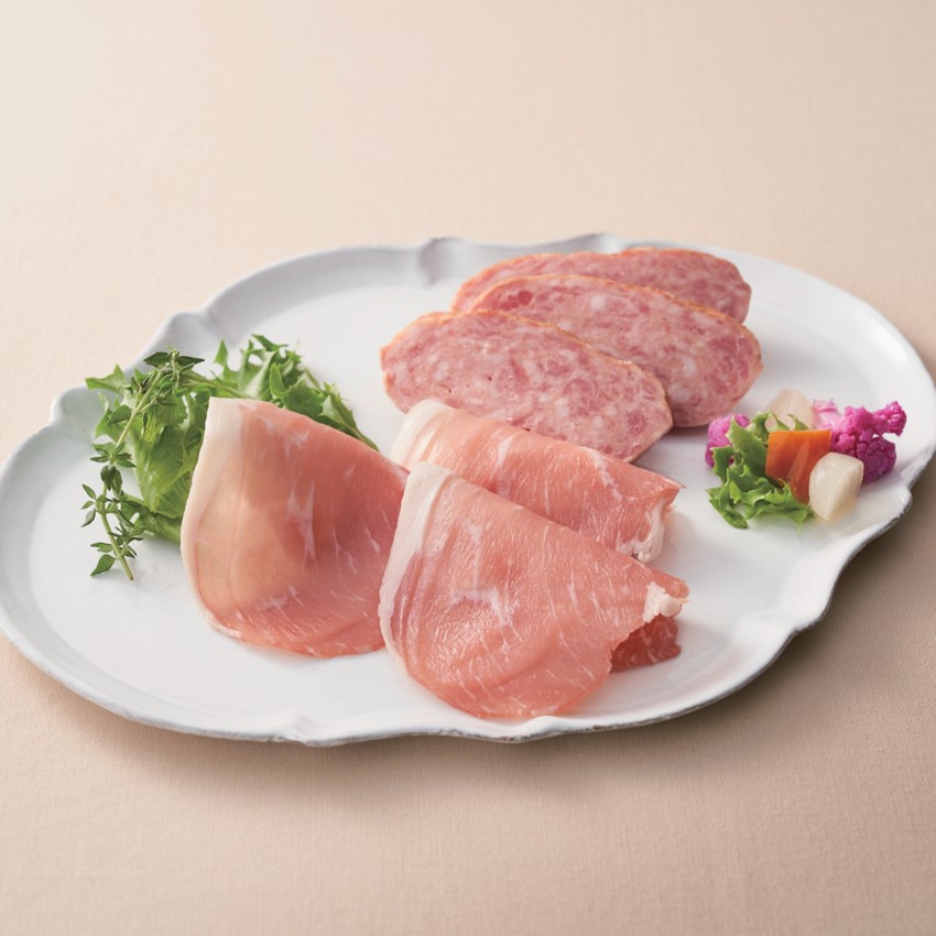 【商品説明文】国産豚を使用した香味豊かなポークローフと、低温でじっくり仕上げた生ハムのセットです。