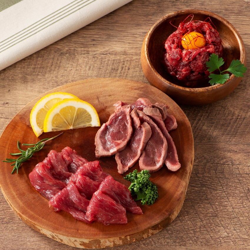 一番人気の上赤身は、赤身ならではの馬肉本来のうま味が口いっぱいに広がり、モチっとしながら歯切れの良い食感も特長です。さらにその赤身の旨みを閉じ込めた、たたきは2層が織りなす食感と香りが特長で、馬刺しとはまた違った味わいをお楽しみいただけます。中トロはサシ(霜降り)と赤身のバランスが絶妙で、赤身の旨みをサシの甘みがより引き立てます。そして今では貴重となったユッケは、丁寧に細切りに仕上げました。ユッケならではの噛む毎に広がるうま味と広がる香りをお楽しみください。