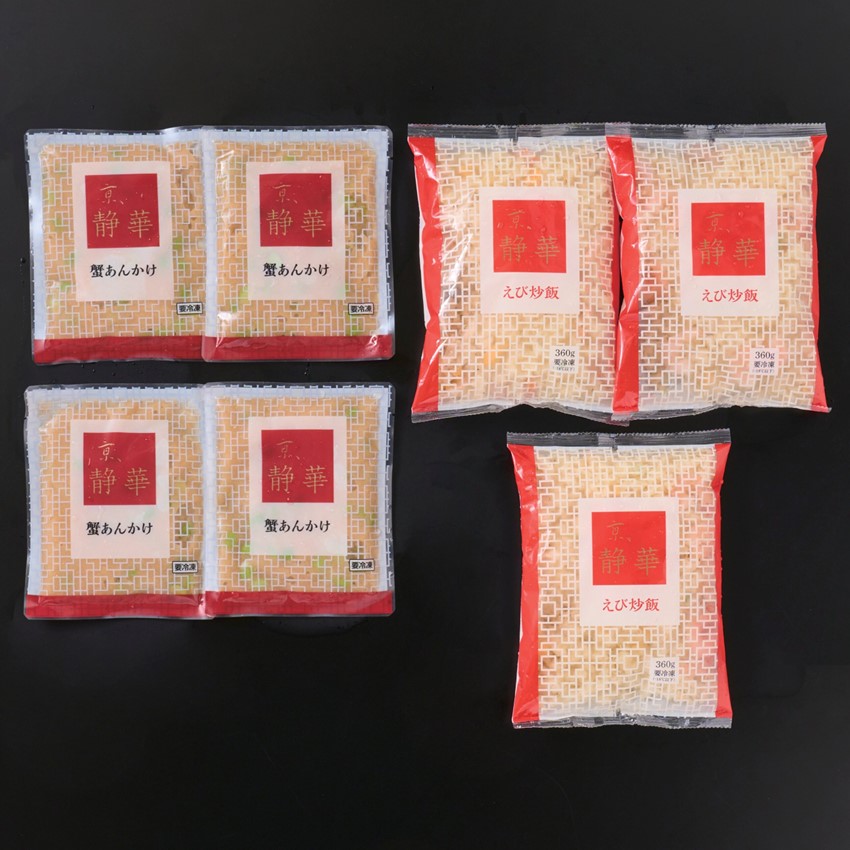 【商品説明文】京都が誇る中華の名店の技が詰まった2品。炒飯は、ぷりぷりのエビに卵、ねぎなどが入った穏やかな食べ心地。レンチンだけで仕上がるパラパラ触感に驚く。あんかけは蟹の風味広がる上品な味。それぞれ楽しむもよし、あんかけ炒飯にしても美味!