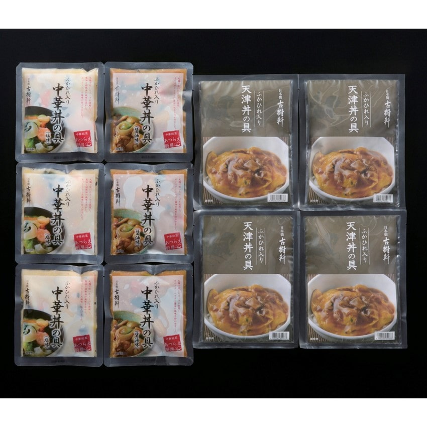 【商品説明文】オイスターエキスの旨みをしっかりと効かせた醤油味と、丸鶏のストレートスープを使用したコクのある塩味の中華丼の具、ふんわりたまごのふかひれ入り天津丼の具のセットです。
