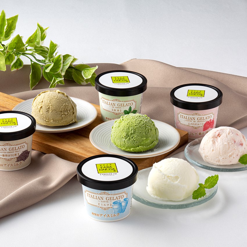 【商品説明文】「KAMANARIYA」のお薦めする、ミルクをベースに苺、抹茶、そして一番茶ほうじ茶のジェラートです。