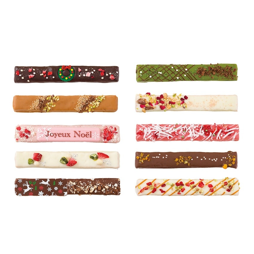 ミルク、ビター、ホワイト、ストロベリーにキャラメル、抹茶、何種類ものチョコレートをベースにストロベリーやラズベリー、刻んだアーモンドやピスタチオ、クランチチョコも使いながら様々なバリエーションをご用意しました。