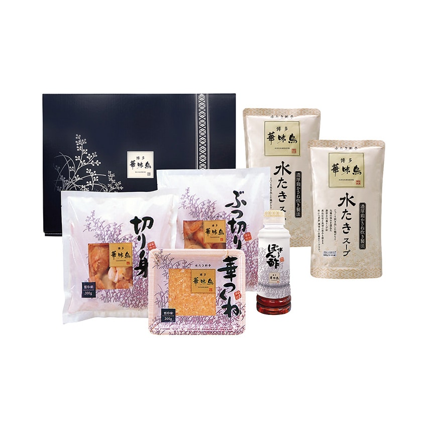 水たきスープ(600g×2)、華味鳥切り身(300g)、華味鳥ぶつ切り(300g)、華つくね(200g)、博多ぽん酢(220ml)