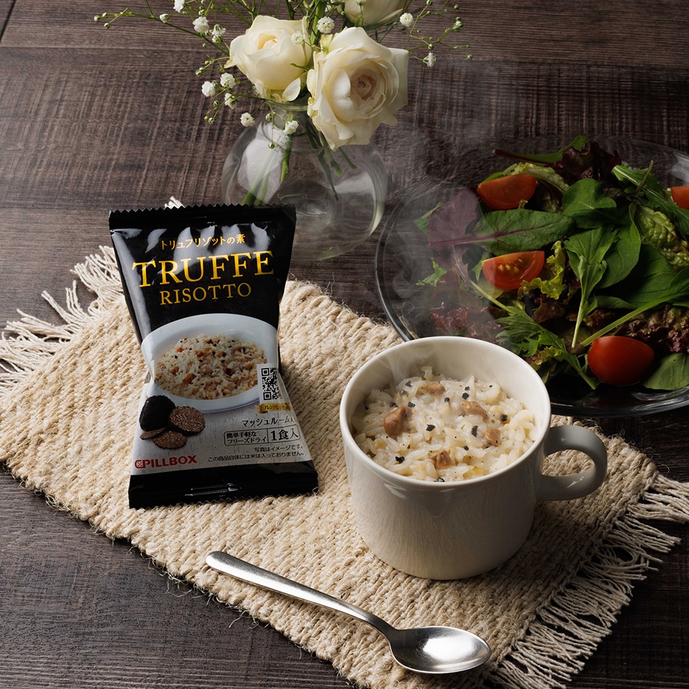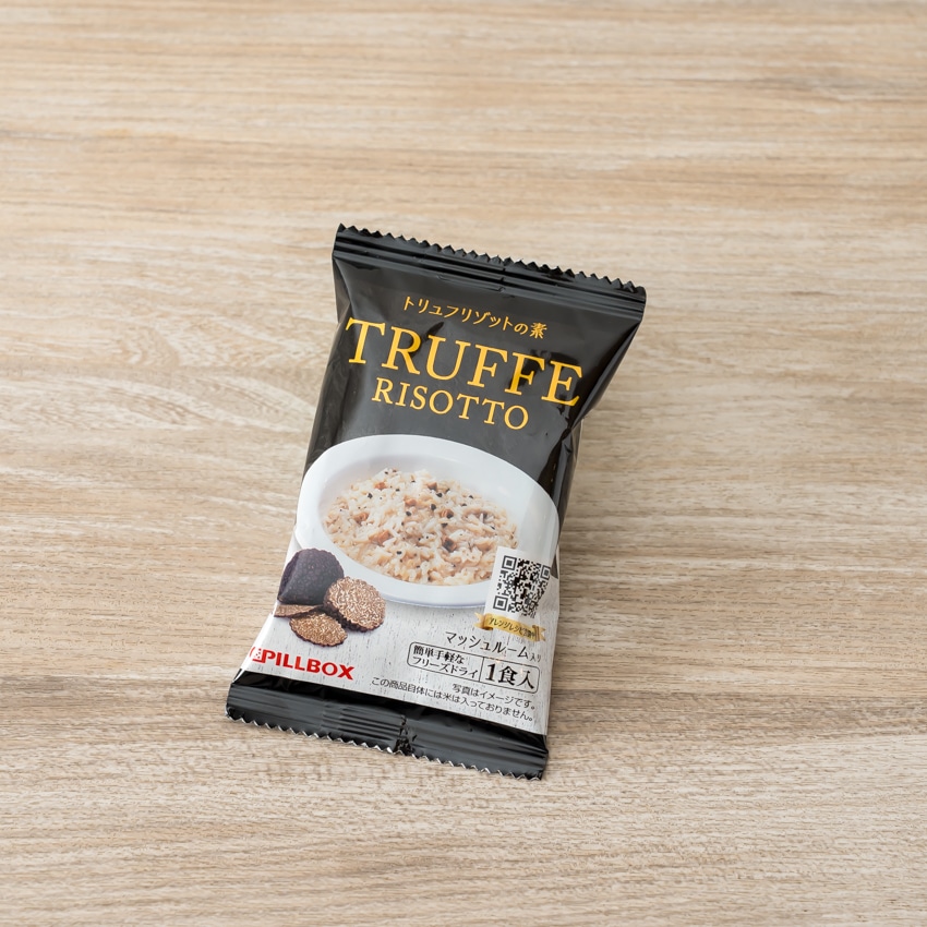あたたかいご飯と、熱湯があれば、高級レストランで食べるような「トリュフのリゾット」が30秒でできてしまう、フリーズドライ食品です。
