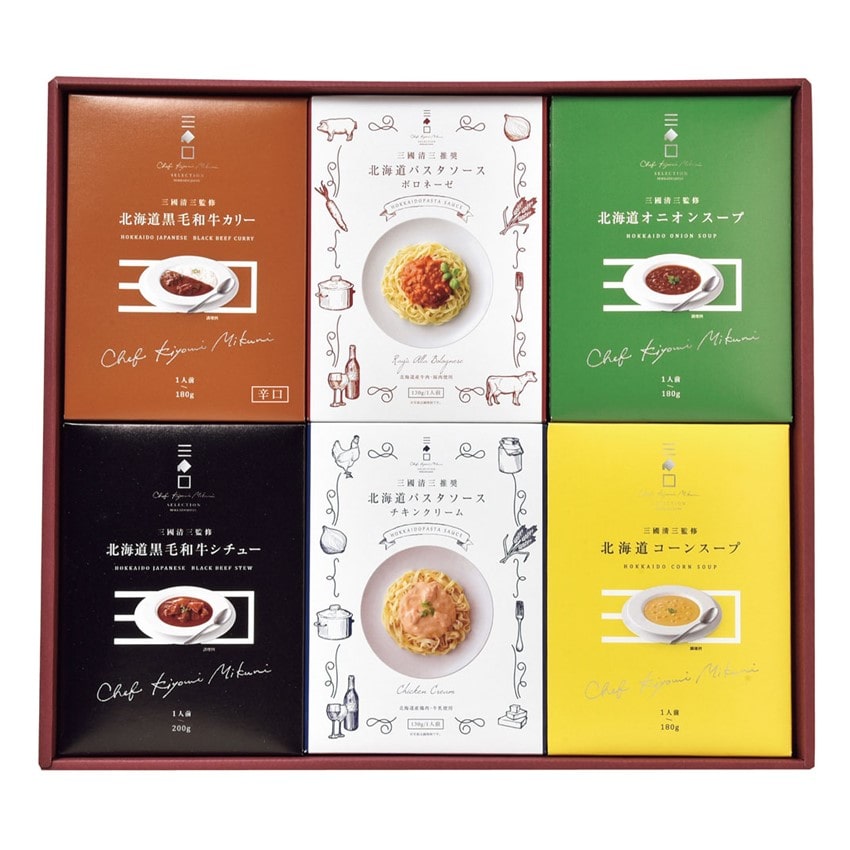 ■ 内容量:三國監修北海道黒毛和牛カリー180g×1、三國監修北海道黒毛和牛シチュー200g×1、三國監修北海道コーンスープ180g×1、三國監修北海道オニオンスープ180g×1、三國推奨北海道パスタソース(ボロネーゼ)130g×1・三國推奨北海道パスタソース(チキンクリーム)130g×1