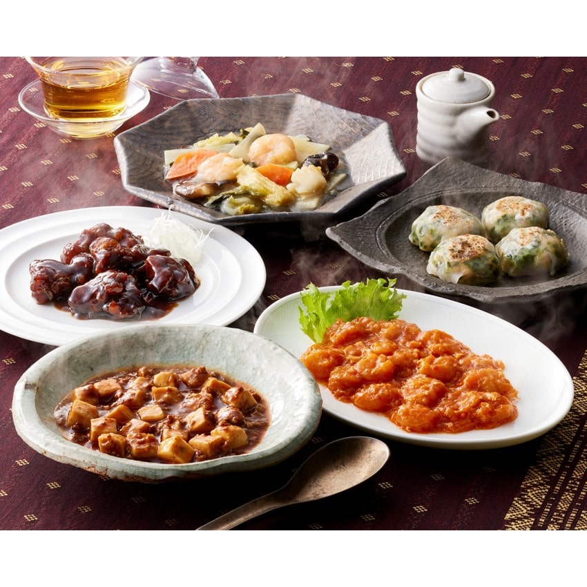 ■ 内容量:ずわい蟹入りエビチリソース130g×1、彩り八宝菜150g×1、黒醋酢豚150g×1、麻婆豆腐(豆腐入り)150g×1、エビニラまんじゅう(4個入)140g×1
