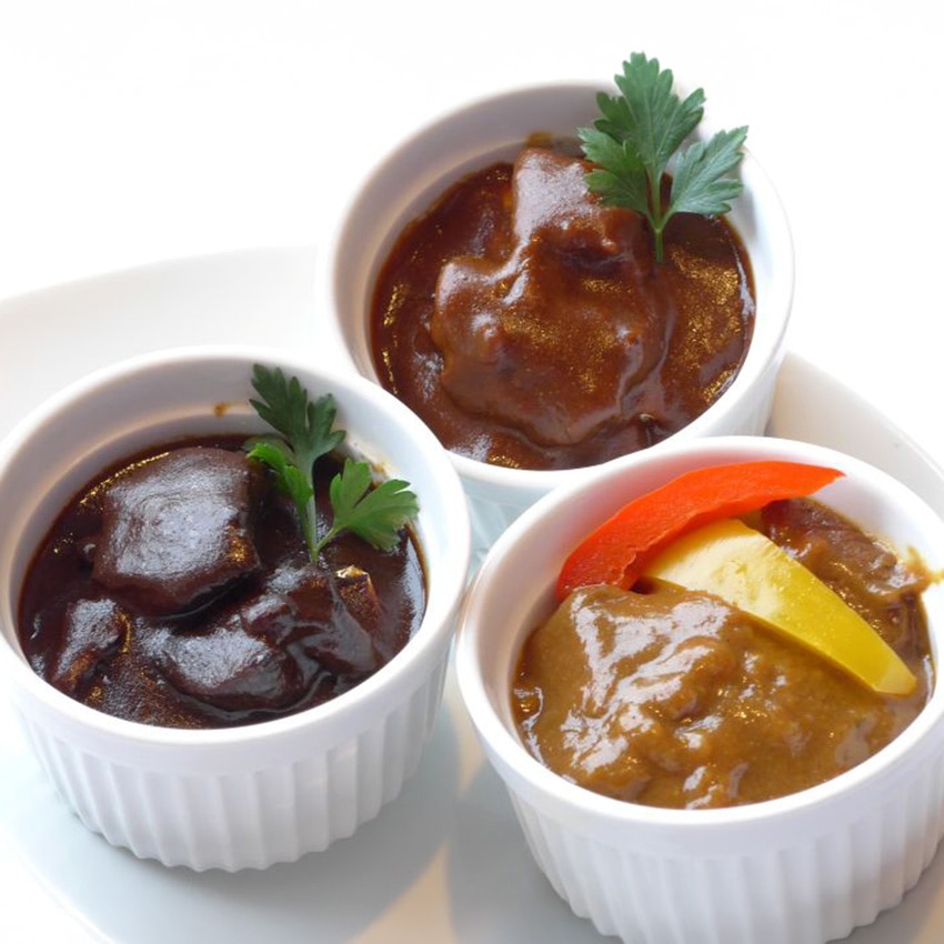 中辛で深いコクのビーフカレー、まろやかな味わいのデミグラスカレー、スパイシーなブラックカレーをお楽しみください。
