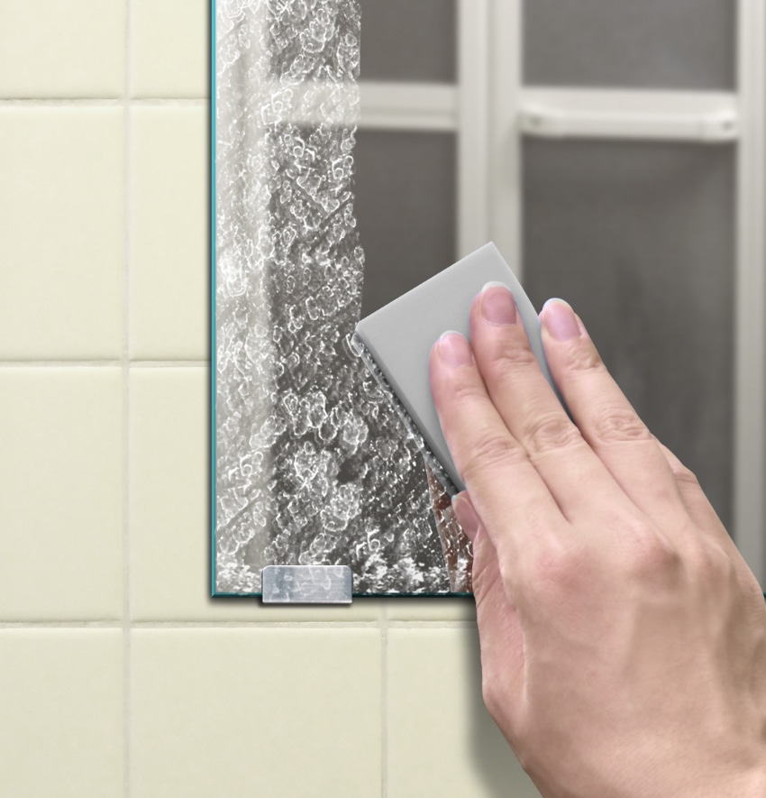 水を付けてこするだけで、頑固な「鏡、ガラス等のウロコ状水垢汚れ」もスッキリ落す事が出来ます。