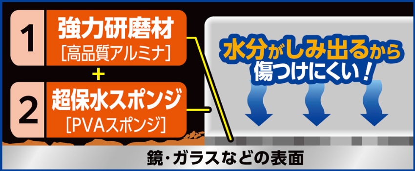 保水性・柔軟性に優れたPVAスポンジとアルミナ砥粒の組み合わせにより、研磨キズが目立ちにくく、高い研磨力を発揮します。