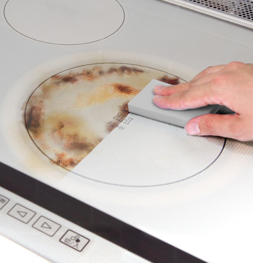 水を付けてこするだけで、頑固な「IH調理器のガラストップの焼きつき・コゲつき汚れ」をスッキリ落とします。