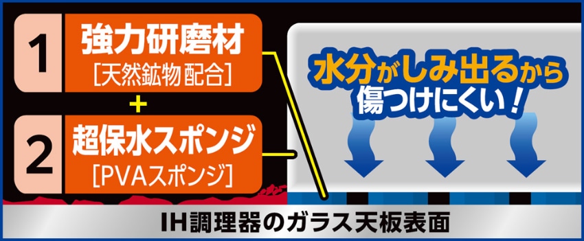 細目で柔らかいケイ酸塩鉱物砥粒を使用しているので、傷付きが心配なIHガラス天板も安心して使用出来て、焼き付き、焦げ付き等の汚れも効率良く除去出来ます。