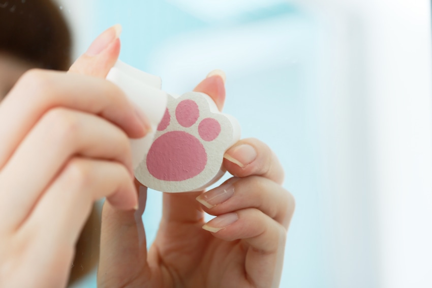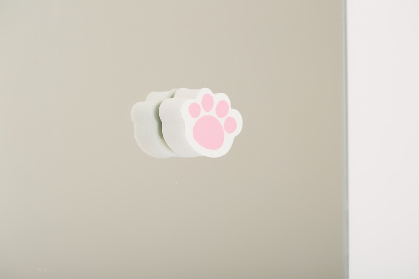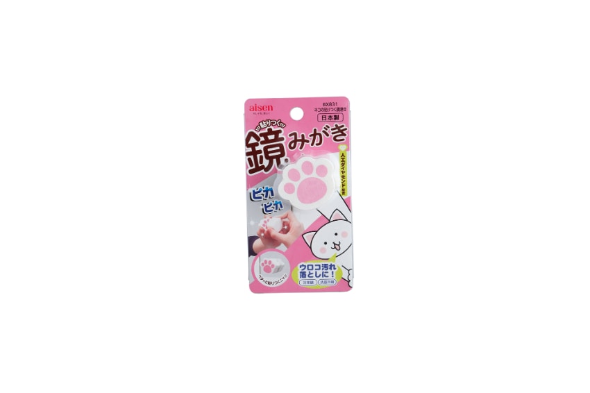 鏡やツルツルした面に貼り付けておける、可愛らしい猫の肉球型の鏡みがきです。鏡についたウロコ汚れや水アカを簡単に落とします。