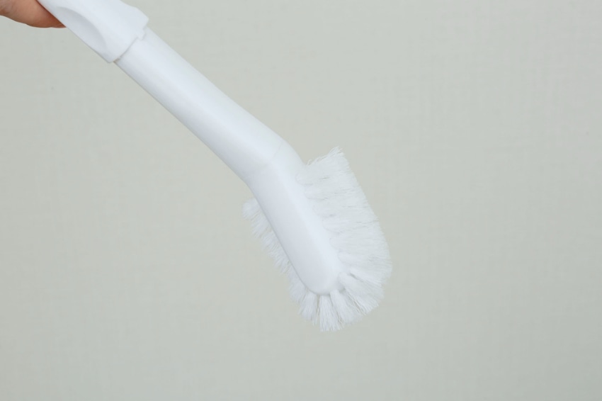 フチ裏が洗いやすい半球型の植毛を採用しました。毛は水ハネしにくいウェーブ加工を施し、小さいながら隅々まで汚れをしっかり落とすブラシです。