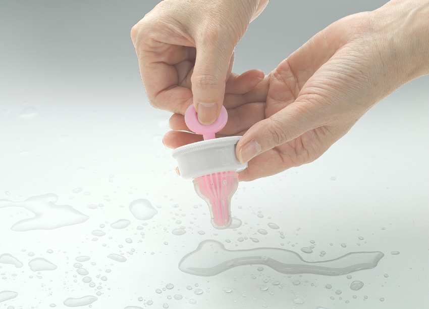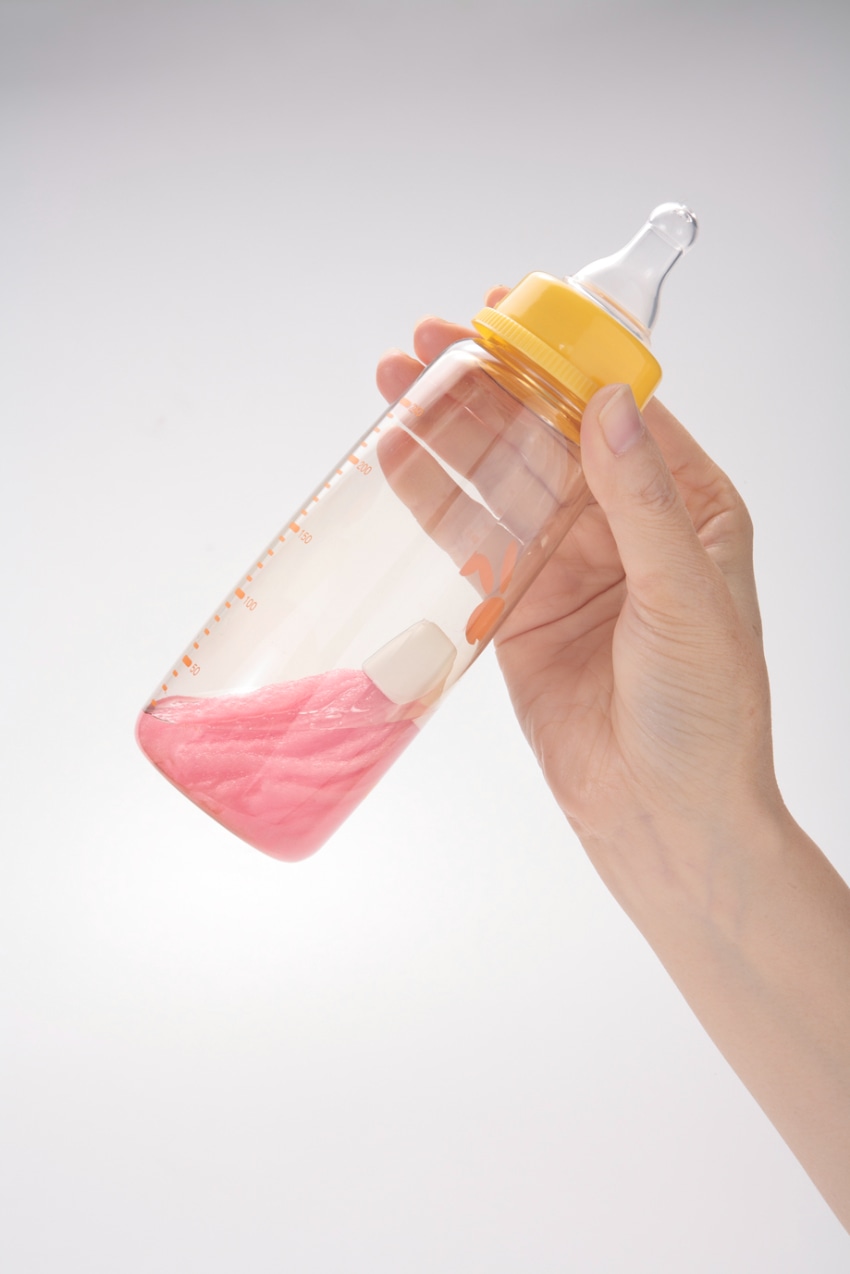 クリーナーをほ乳びんに入れ、キャップをしめて振るだけで、内側の汚れを落とします。