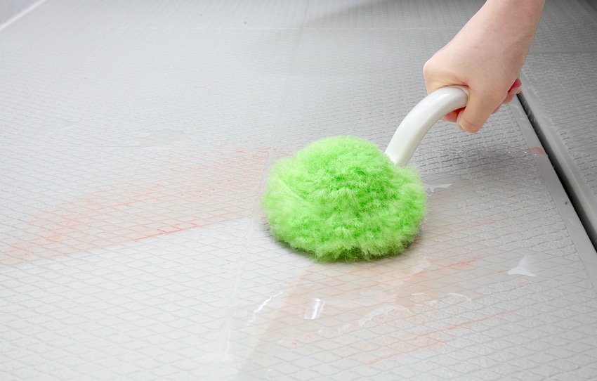 洗剤を使用する場合でもごく少量で汚れが落とせるため、経済的です。繊維で洗うので水ハネせず、キズをつけません。