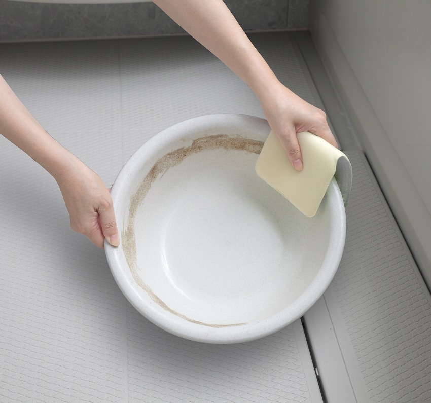 洗剤を使用する場合でもごく少量で汚れが落とせるため、経済的です。繊維で洗うので水ハネせず、キズをつけません。