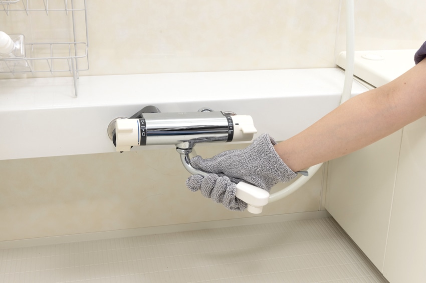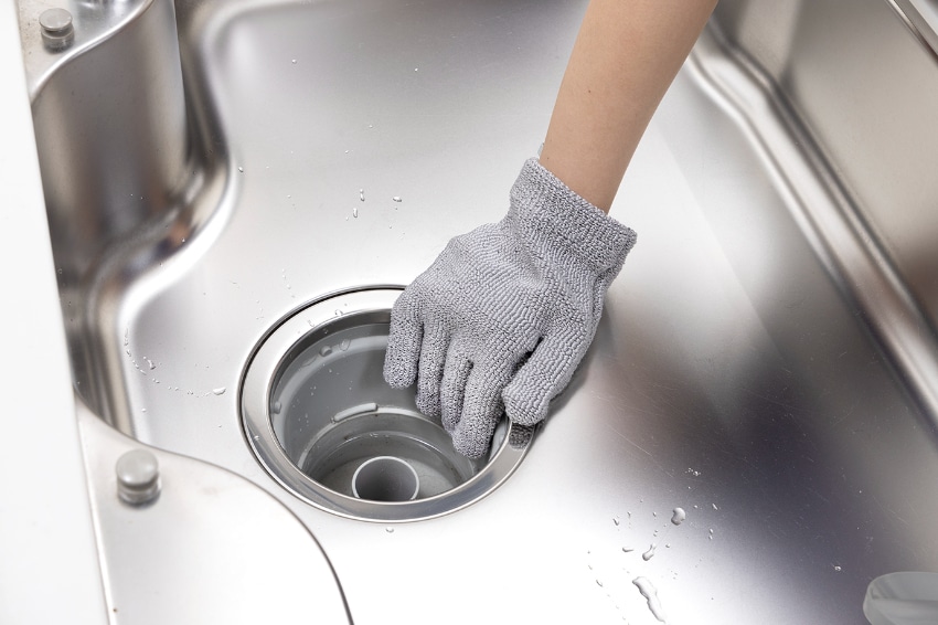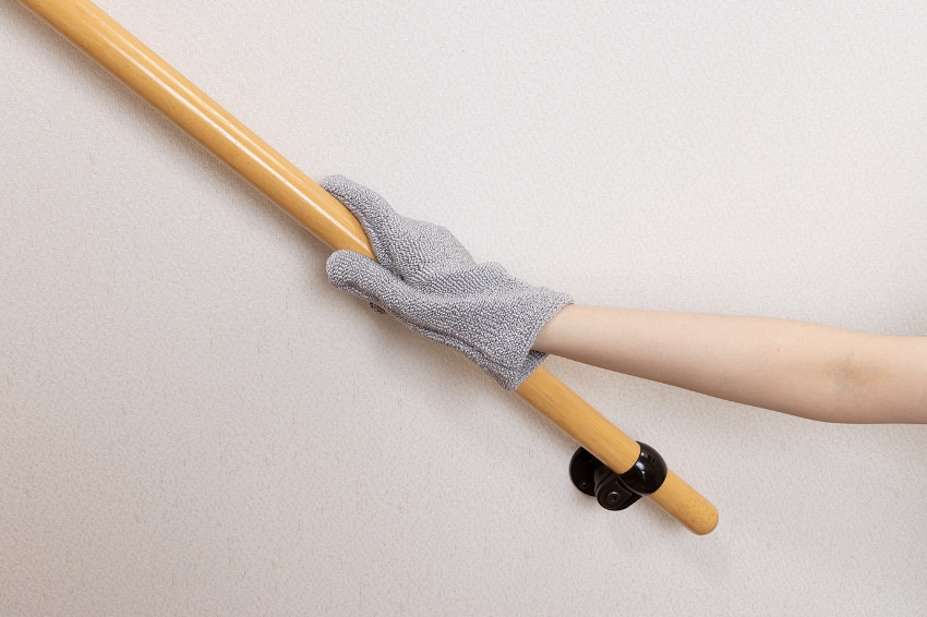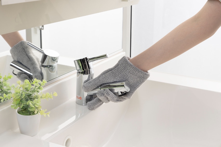 手にはめるので、広い面も細かいところも洗えます。水だけでも汚れを落とす繊維なので、キズをつけません。