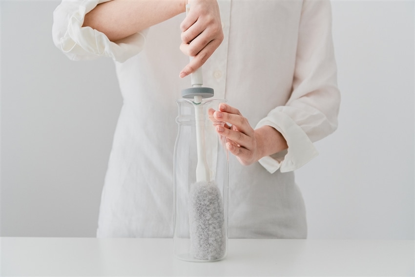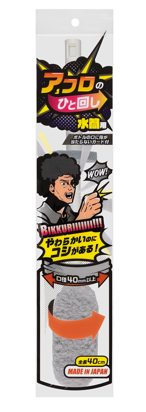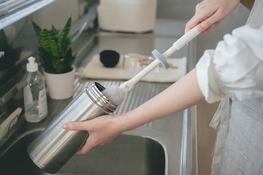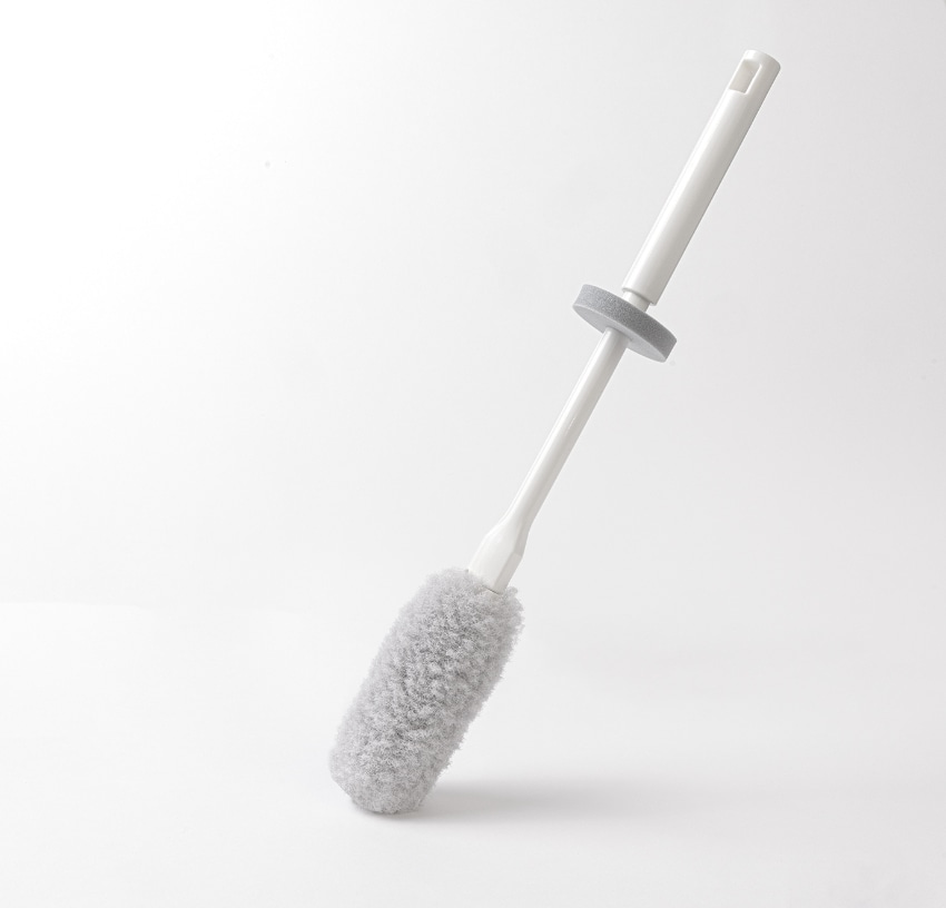 ステンレスボトルや冷水筒洗いに最適です。ボトルの口に指が当たらないように、ガードがついています。ガードが不要の際は取り外せます。