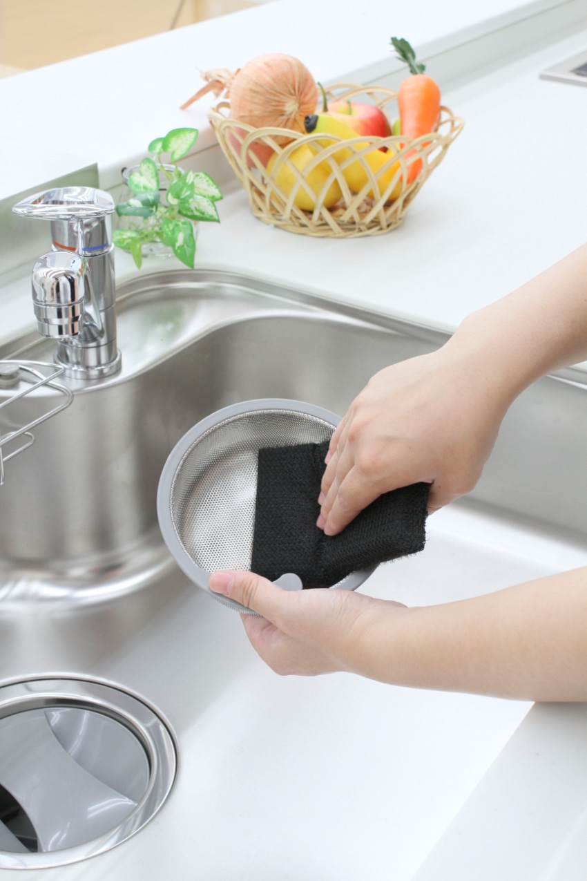 排水口や三角コーナーの細かい網目までしっかり洗えますよ。シンク周りもこれひとつあればスッキリきれい!黒色で汚れも目立ちにくい♪