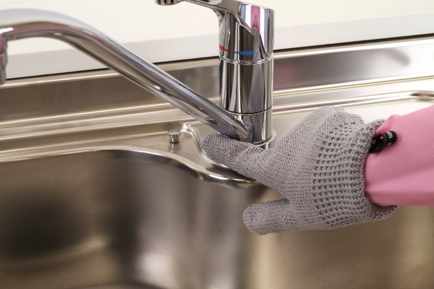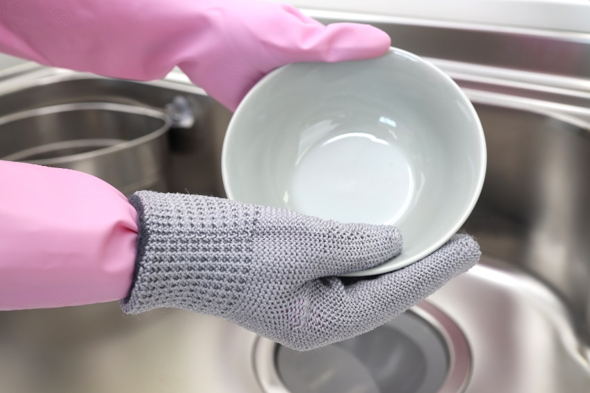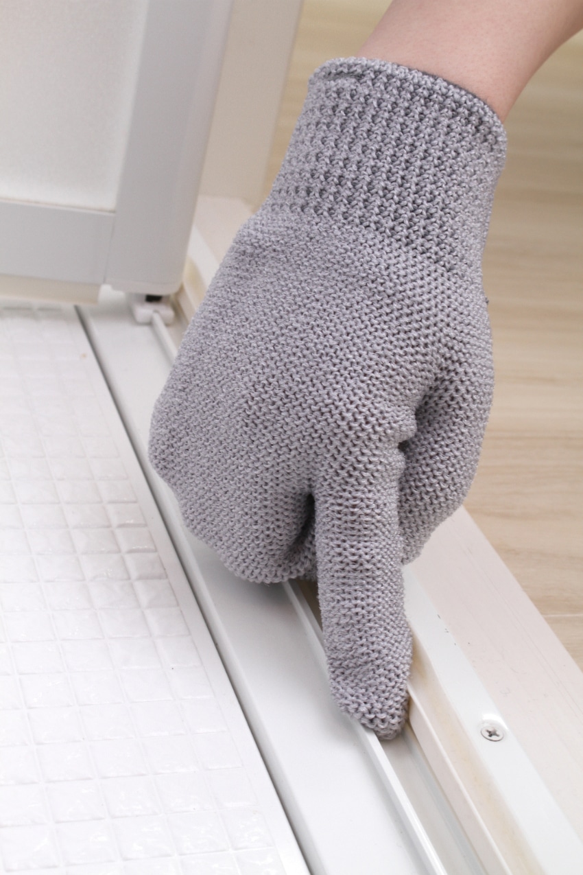 この手袋たわしは、三角形の断面を持つ「異形断面繊維」を使っているので、水だけでもしっかり汚れを落とすことができます。