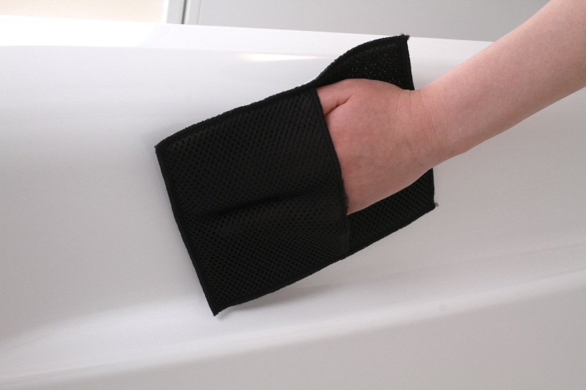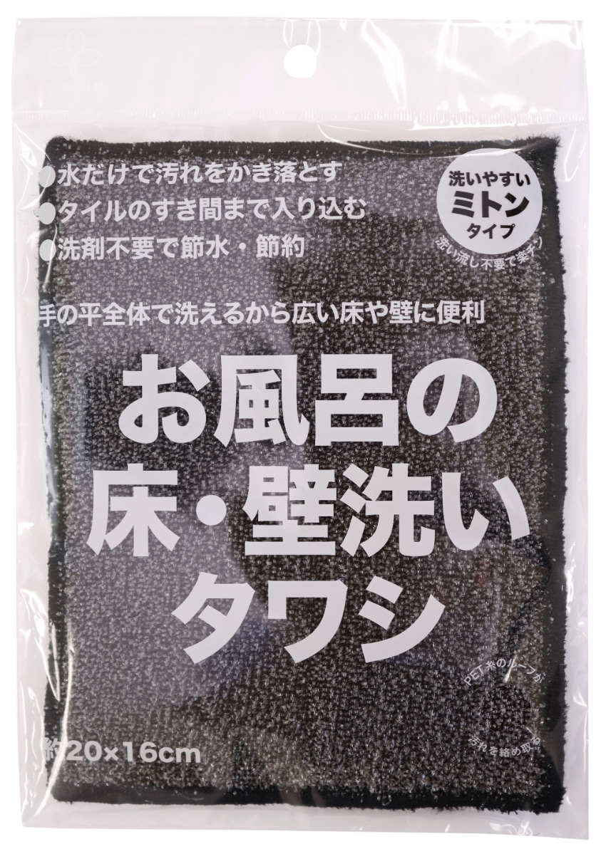 手にはめて使えるミトンタイプで、広い壁や床だけでなく、細かいところも洗いやすいのが特徴です。便利な吊りヒモ付き。