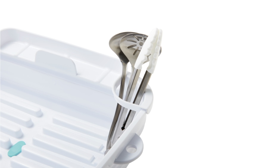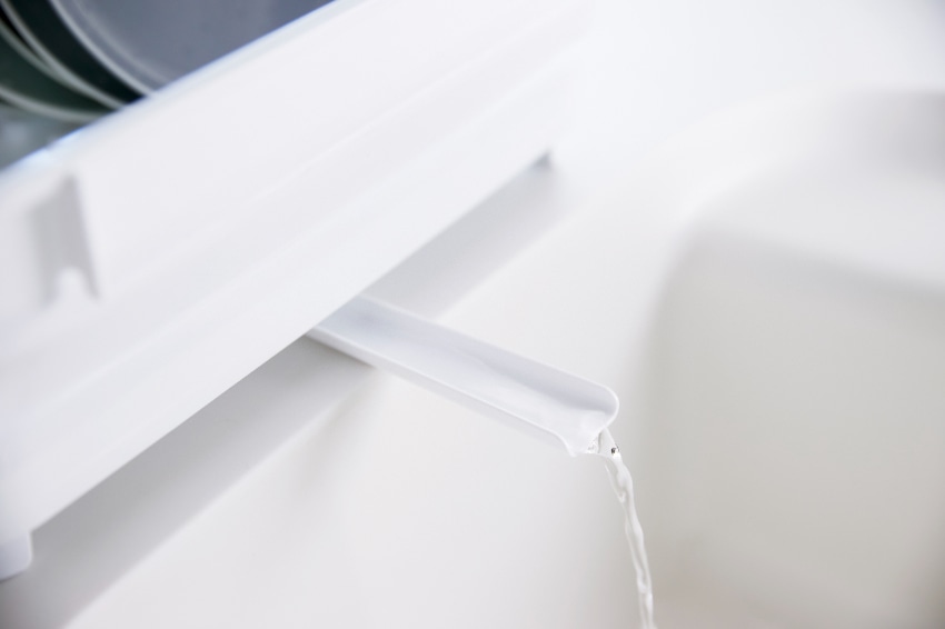 排水栓で水抜きもラクラク、排水スパウトは縦横自由に回転できます。スリットを利用してお皿や鍋フタが立てられます。