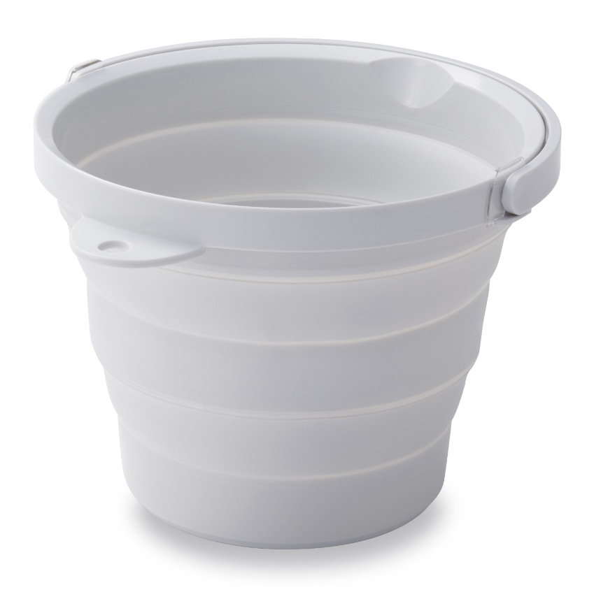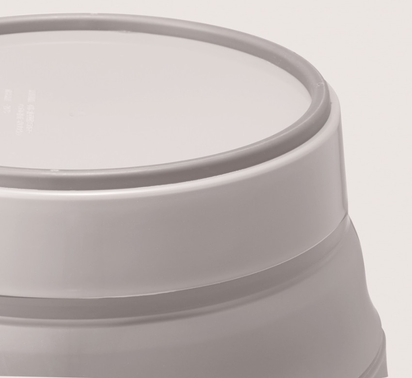 やわらか素材のソフトバケツにくすみカラー。こちらはフタ付きタイプです。
